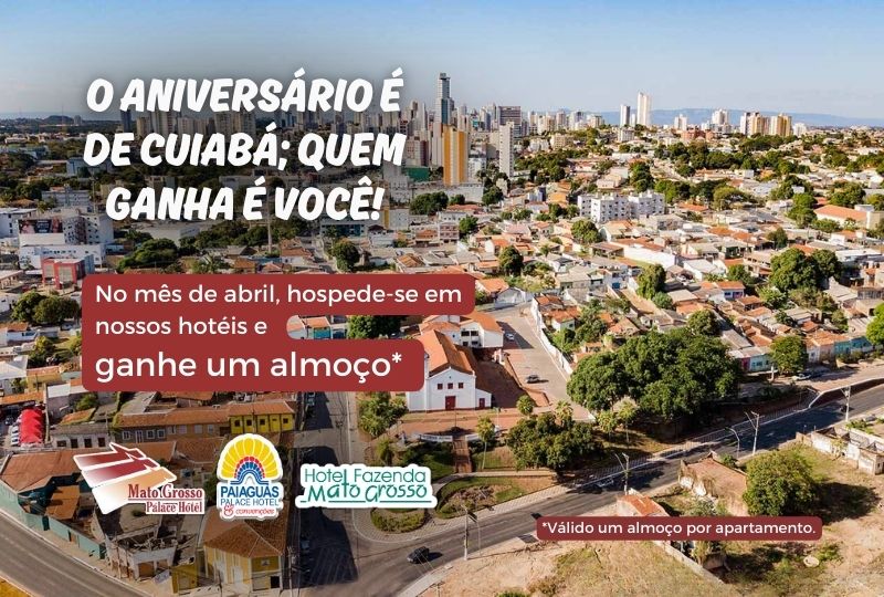 Celebre o aniversário de Cuiabá conosco!Para comemorar o aniversário da nossa adorada cidade, estamos presenteado você com 01 almoço de cortesia durante sua hospedagem em nossos hotéis participantes: